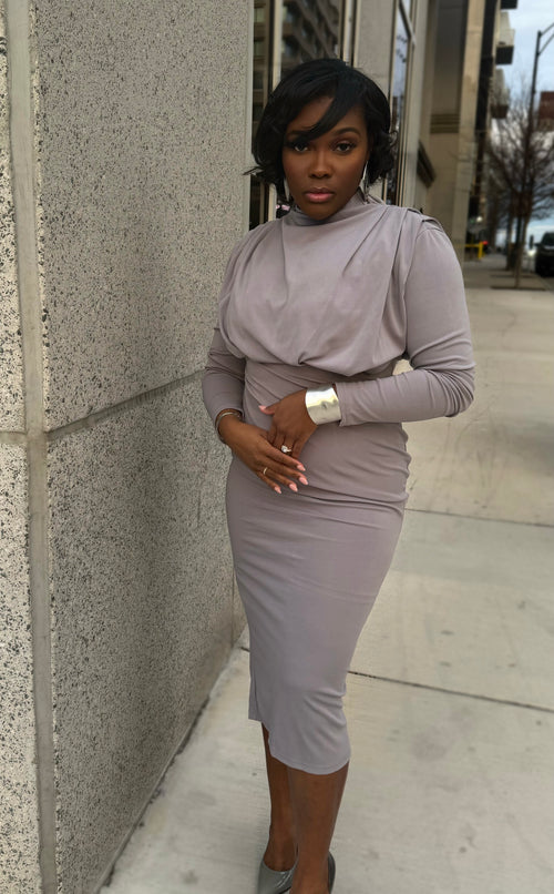 ELEGANT MOCK NECK DRESS - GREY